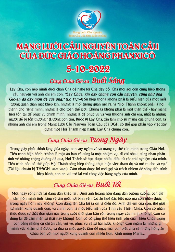 Mạng lưới cầu nguyện toàn cầu của Đức Thánh Cha – Ngày 05 tháng 10 năm 2022 0 By cdlavang on October 5, 2022 CẦU NGUYỆN - PRAYERS