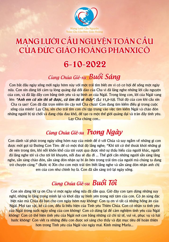 You are at:Home»CẦU NGUYỆN - PRAYERS»Mạng lưới cầu nguyện toàn cầu của Đức Thánh Cha – Ngày 06 tháng 10 năm 2022