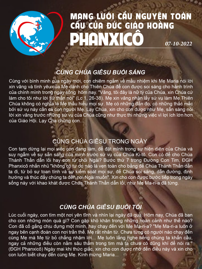 Mạng lưới cầu nguyện toàn cầu của Đức Thánh Cha – Ngày 07 tháng 10 năm 2022 0 By cdlavang on October 7, 2022 CẦU NGUYỆN - PRAYERS