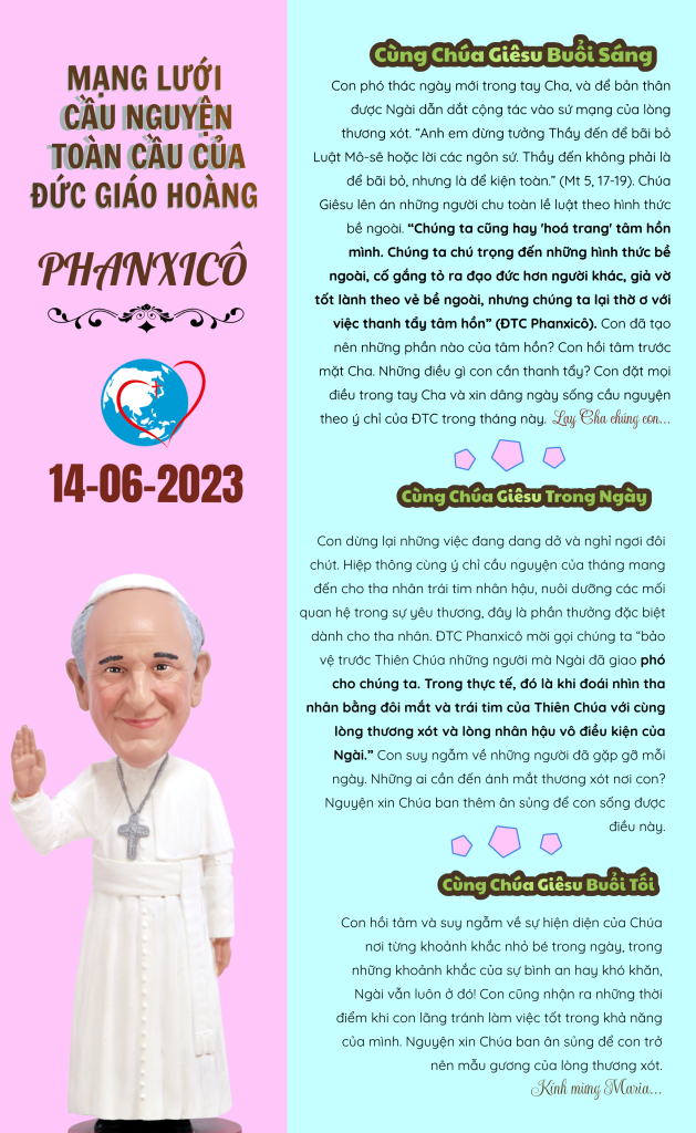 Con dừng lại những việc đang dang dở và nghỉ ngơi đôi chút. Hiệp thông cùng ý chỉ cầu nguyện của tháng mang đến cho tha nhân trái tim nhân hậu, nuôi dưỡng các mối quan hệ trong sự yêu thương, đây là phần thưởng đặc biệt dành cho tha nhân. ĐTC Phanxicô mời gọi chúng ta “bảo vệ trước Thiên Chúa những người mà Ngài đã giao phó cho chúng ta. Trong thực tế, đó là khi đoái nhìn tha nhân bằng đôi mắt và trái tim của Thiên Chúa với cùng lòng thương xót và lòng nhân hậu vô điều kiện của Ngài.” Con suy ngẫm về những người đã gặp gỡ mỗi ngày. Những ai cần đến ánh mắt thương xót nơi con? Nguyện xin Chúa ban thêm ân sủng để con sống được điều này.