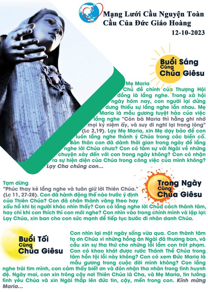 Chủ đề chính của Thượng Hội đồng là lắng nghe. Trong xã hội ngày hôm nay, con người lại dửng dưng thiếu sự lắng nghe lẫn nhau. Mẹ Maria là mẫu gương tuyệt hảo của việc lắng nghe “Còn bà Maria thì hằng ghi nhớ mọi kỷ niệm ấy, và suy đi nghĩ lại trong lòng” (Lc 2,19). Lạy Mẹ Maria, xin Mẹ dạy bảo để con luôn lắng nghe thánh ý Chúa trong các biến cố. Bản thân con đã dành thời gian trong ngày để lắng nghe lời Chúa chưa? Con có tâm sự với Ngài về những chuyện xảy đến với con trong ngày không? Con có nhận ra sự hiện diện của Chúa trong công việc của mình không? Lạy Cha chúng con…