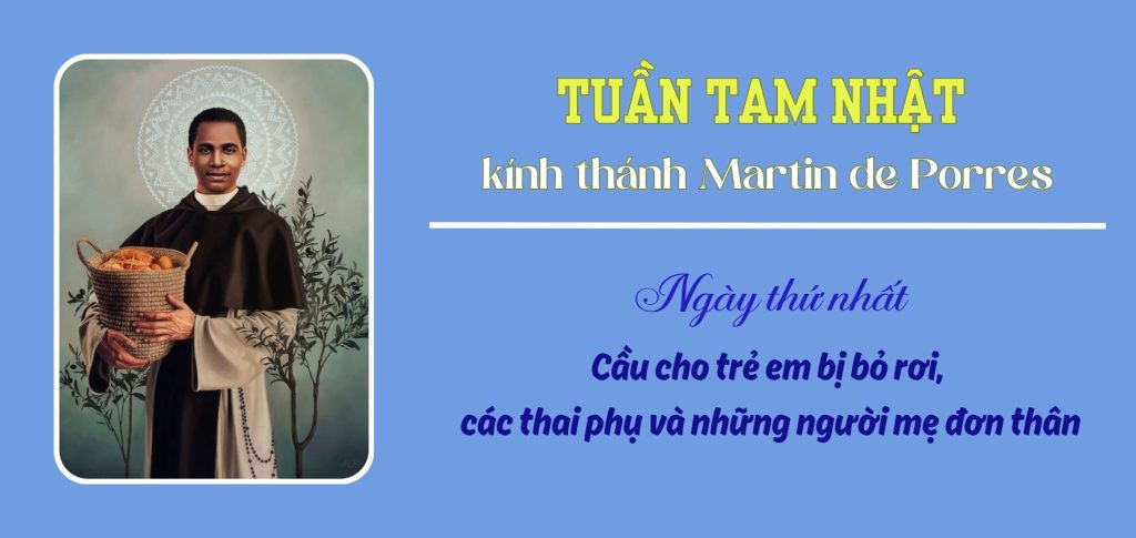 Trong ngày thứ I của Tuần Tam Nhật kính Thánh Martin de Porres hôm nay, chúng ta xin thánh nhân cầu bầu cùng Chúa cho các thai nhi và các trẻ em bị từ chối nhận được sự trợ giúp cần thiết và kịp thời để các em được chào đời và sống tuổi thơ hạnh phúc. Đồng thời, chúng ta cũng cầu nguyện những người thai phụ và những người mẹ đơn thân bị bỏ rơi được ơn can đảm chấp nhận hoàn cảnh riêng của mình và thánh hóa nó, để trong mọi nỗi thăng trầm của cuộc sống vẫn biết tín thác, cậy trông vào Lòng Thương Xót của Chúa và biết nuôi dạy con trong đức tin.