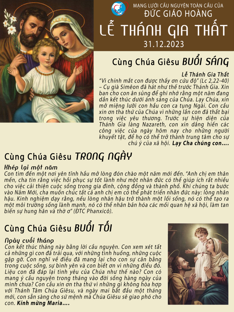 “Vì chính mắt con được thấy ơn cứu độ” (Lc 2,22-40) – Cụ già Simêon đã hát như thế trước Thánh Gia. Xin ban cho con ân sủng để ghi nhớ rằng một năm đangdần kết thúc dưới ánh sáng của Chúa. Lạy Chúa, xin mởmiệng lưỡi con hầu con ca tụng Ngài. Con cầu xin ơntha thứ của Chúa vì những lần con đã thất bại trong việcyêu thương. Trước sự hiện diện của Thánh Gia làngNazareth, con xin dâng hiến các công việc của ngàyhôm nay cho những người khuyết tật, để họ có thể trởthành trung tâm cho sự chú ý của xã hội. Lạy Cha chúng con….